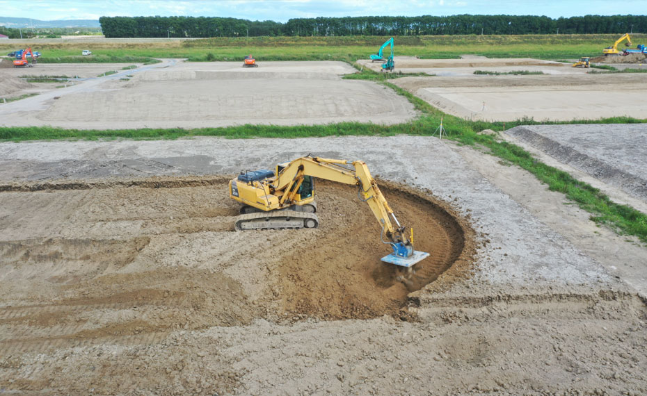 地面の高さや勾配を整え、締固めを行い、均一で安定した地盤をつくります。
