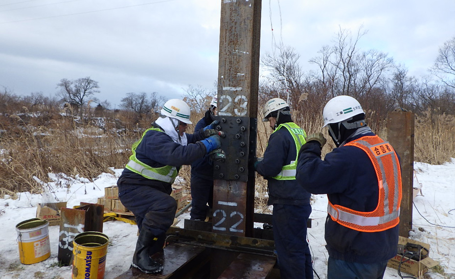 橋の荷重を地盤に伝える「足元」をつくる工事です。場所打ち杭や鋼管杭、直接基礎など、地盤条件に応じて最適な方式を採用します。橋全体の安定性を支える、いわば“陰の立役者”です。