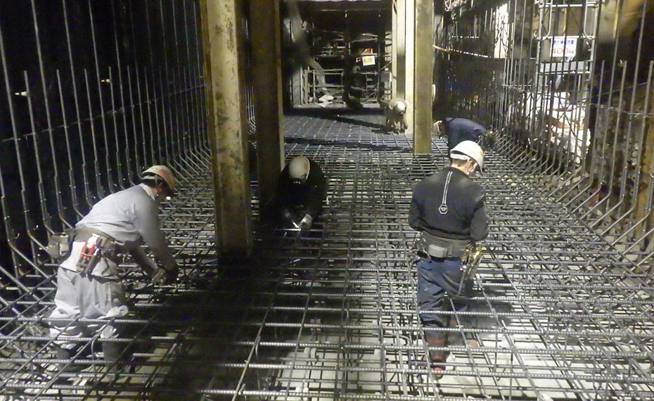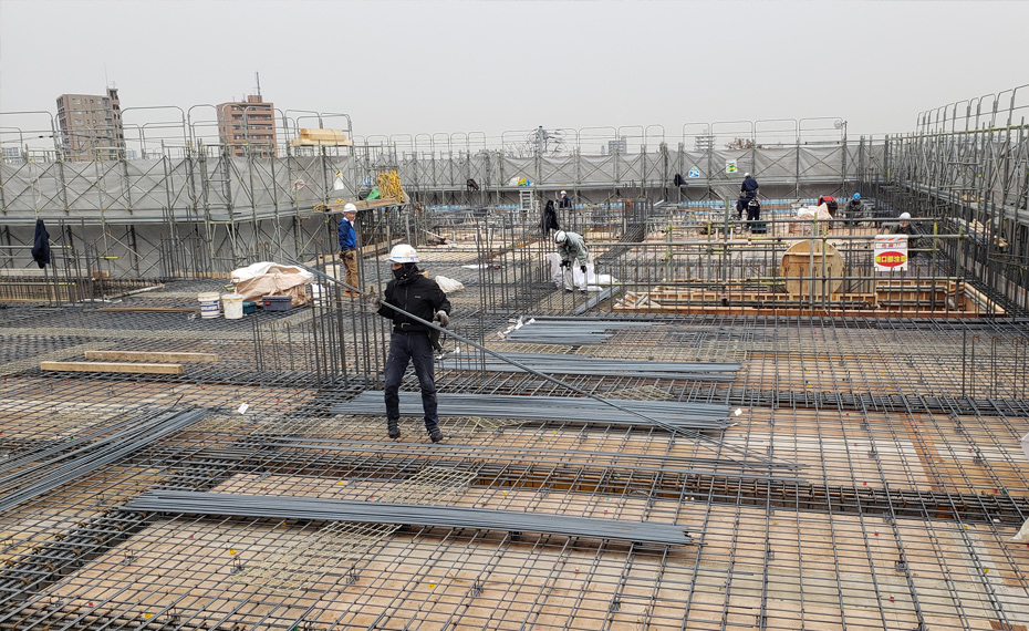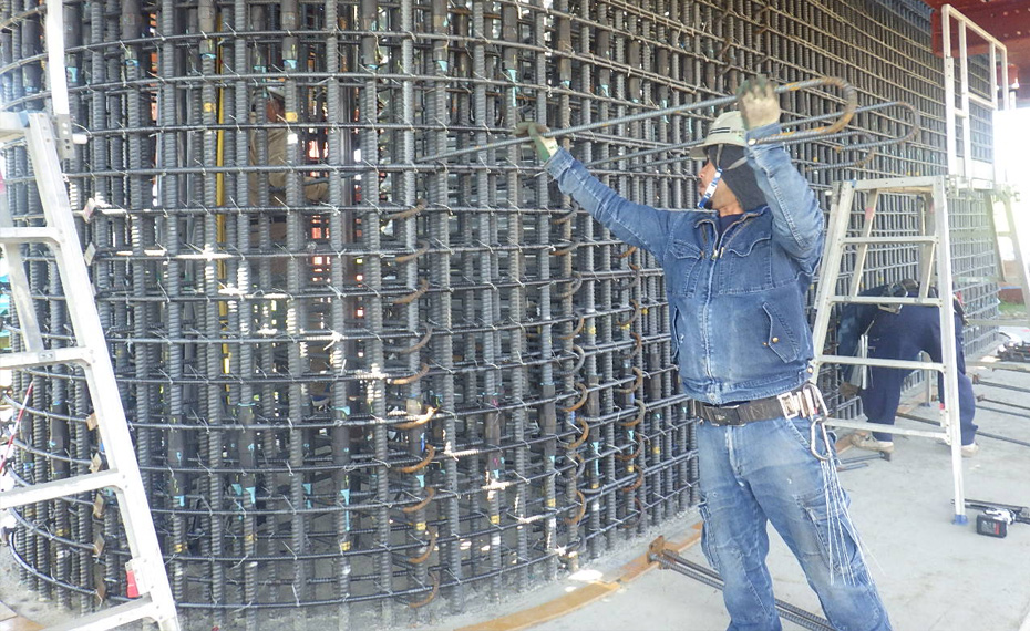 コンクリートを流し込むための「型」を木材や金属で組み上げ、正確な形をつくる作業。構造体の仕上がりの精度を左右します。 - 鉄筋組立