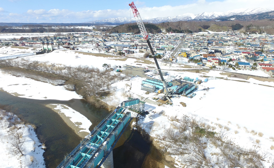 鋼橋工事の“花形”ともいえる工程です。工場で製作された鋼桁を現場で組み立て、クレーンやベント工法、送り出し工法などで所定位置に架け渡します。数十トンにもおよぶ部材をミリ単位で調整しながら架設する技術は、まさに職人技と科学の融合です。