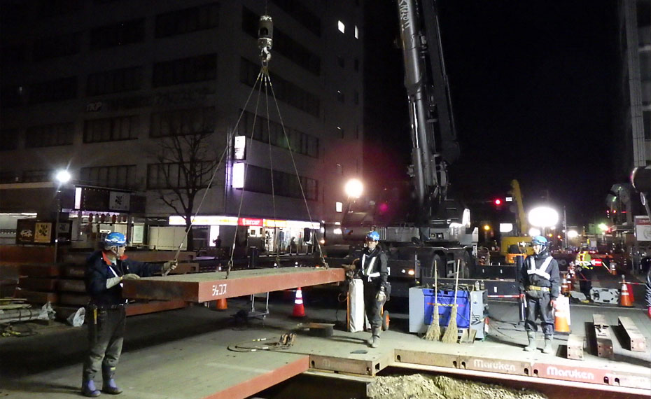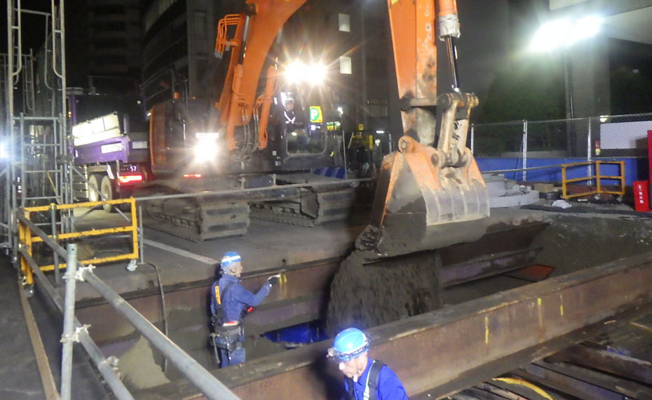 掘削範囲を覆うための仮設桁や覆工板を設置し、地上交通や作業動線を確保します。都市部では人や車の流れを止めずに工事を進めるため、欠かせない工程です。