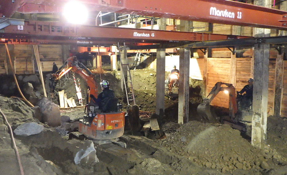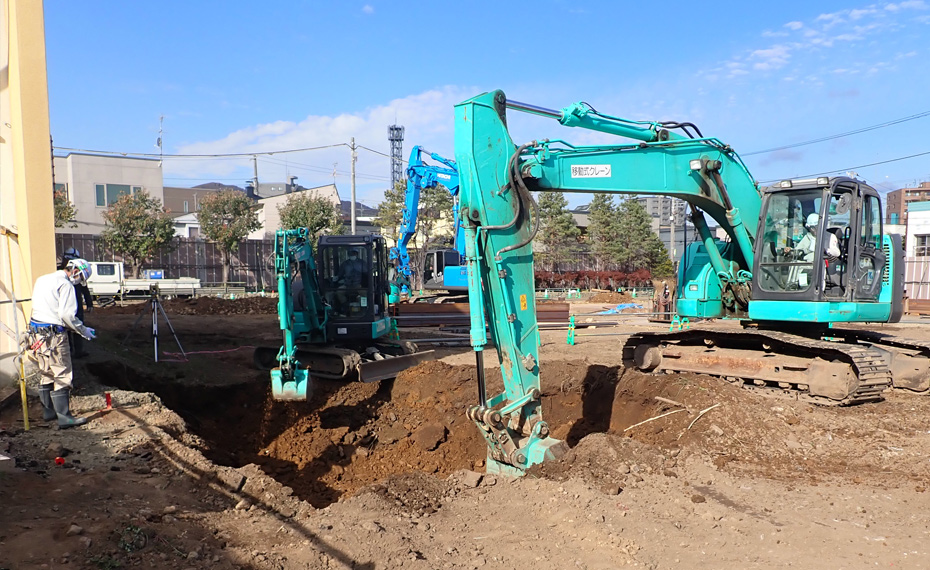 基礎や地下部分を築くため、設計に基づいて地盤を掘削します。 - 山留め工事