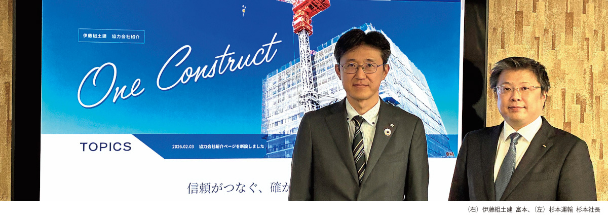公開に先立ち行われた記者説明会では、当社建築部部長 富本憲幸と、協力会の制作メンバーを代表してご出席いただいた株式会社杉本運輸 代表取締役 杉本憲昭氏ががっちり握手。今後も協力会社の皆様の声を継続的に反映しながら、求職中の方にとっては建設業の多様な仕事を知る入口として、協力会社にとっては求人・情報発信の場として、より有用なコンテンツへと発展させていくことを確認し合いました。