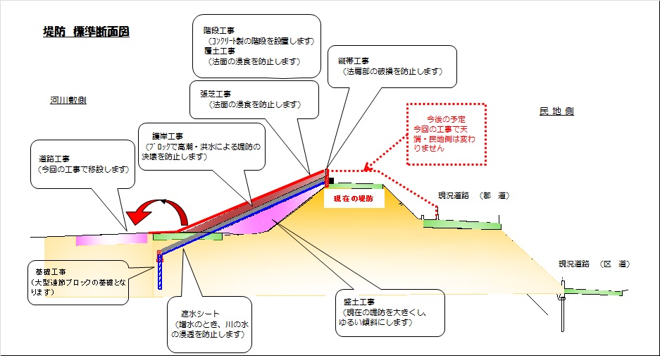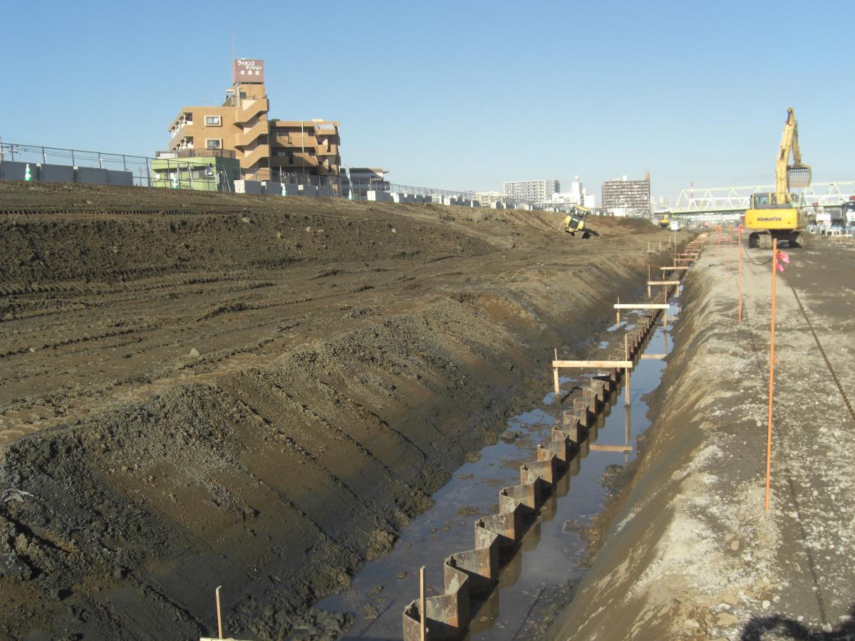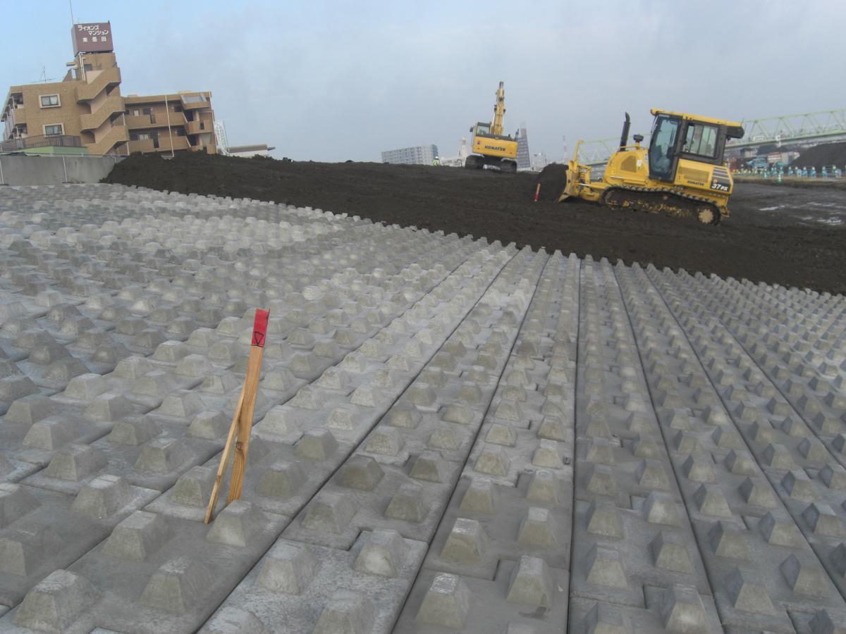 施工実績 ホーム 施工実績 H27東墨田高潮堤防工事 H27東墨田高潮堤防工事土木河川・港湾関東2017年竣工荒川の既存堤防に腹付盛土(大きくゆるい傾斜に盛土)を行い、その傾斜部分にコンクリート製ブロックを設置した後、再度土を被せて芝を張る堤防強化工事です。 概要竣工2017年3月用途河川・港湾所在地東京都墨田区発注者関東地方整備局 荒川下流河川事務所地図地図を戻す前へ戻る戻る次へ