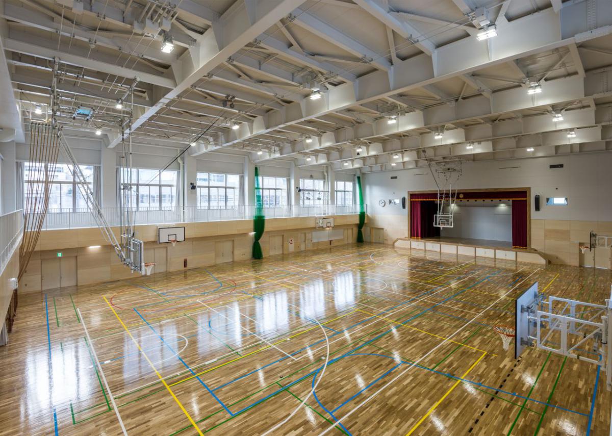 1年目は既存グランド部分に屋内運動場と新校舎半分を施工しています。新屋内運動場は既存校舎と渡り廊下で接続して先に引渡し、使用を開始しました。