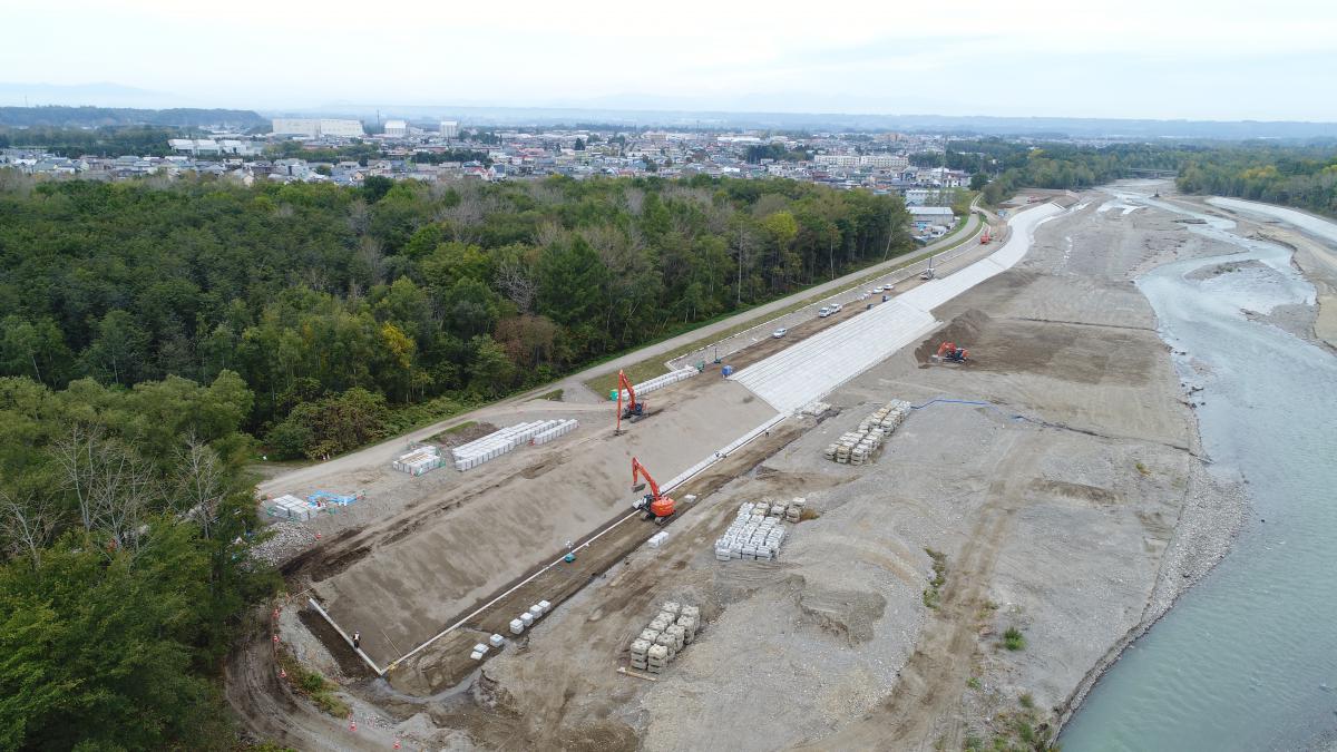 | 主要数量 | 掘削・・・・・・・・・V=20,340m3 整地・・・・・・・・・V=18,700m3 路体(築堤)盛土・・・V=20,520m3 土砂等運搬・・・・・・V=17,560m3 プレキャスト基礎・・・L=990m 平ブロック張・・・・・A=9,028m2 連節ブロック張・・・・A=1,962m2 連節ブロック清掃・・・A=2089m2 根固めブロック据付・・N=1,365個 植生工・・・・・・・・A=2,380m2 覆土・・・・・・・・・V=1,800m2 |
