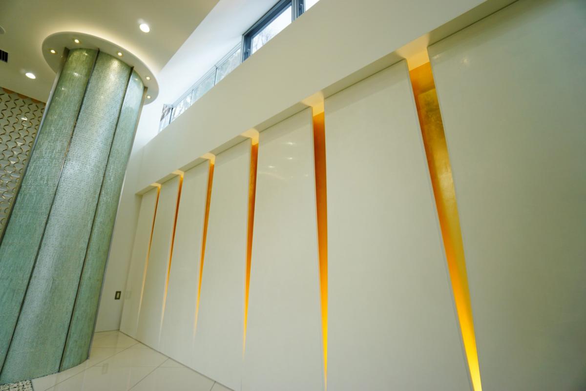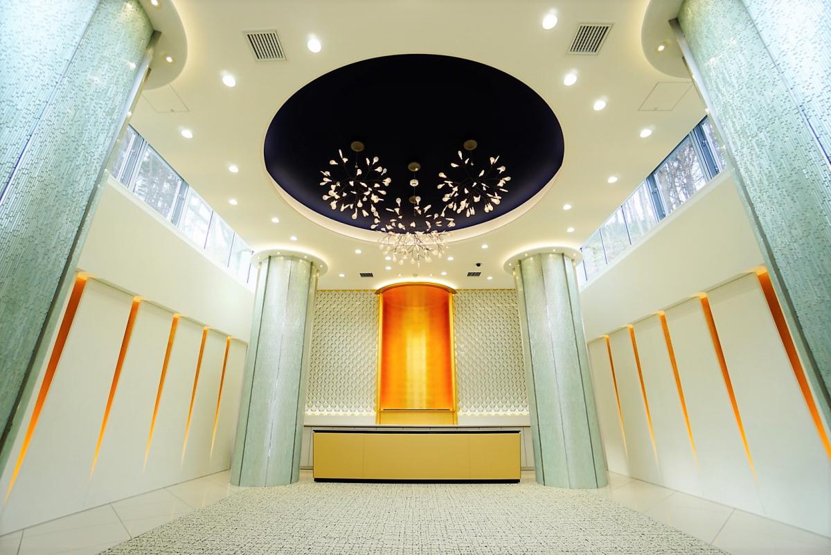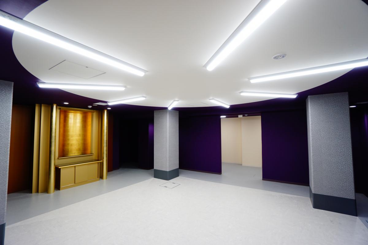 外観や1F内部は「神聖な場所」という意味を持つ白を基調としたカラーデザインとし、地下階の納骨堂は「神秘」や「高貴」を表す紫を使用して落ち着いた雰囲気となっています。1F礼拝堂を見上げると、中央には雲をイメージとしたシャンデリア、その周りには星空を連想させるダウンライトが散りばめられています。