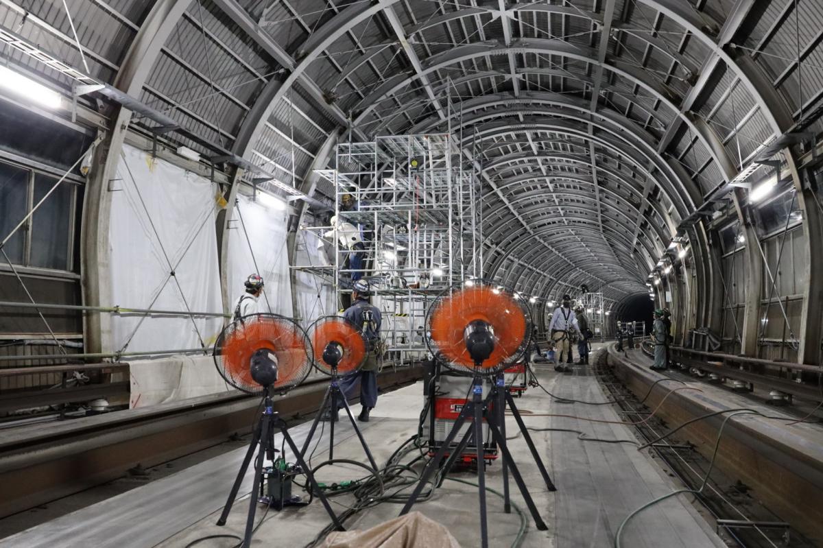 施工実績 ホーム 施工実績 地下鉄南北線シェルター 耐震改修 (南平岸-澄川間) 地下鉄南北線シェルター 耐震改修 (南平岸-澄川間)令和3年度札幌市交通局優秀工事建築交通施設札幌2022年竣工開業から50年経ち、耐震性を高めるために施工された、南平岸駅から澄川駅間の地上部分(約250m)の耐震改修工事です。 工事内容は、壁・屋根ブレースの新設、既設部材のサイズアップ、柱脚部の補強です。 概要竣工2022年3月用途交通施設所在地札幌市豊平区発注者札幌市交通局地図地図を戻す前へ戻る戻る次へ