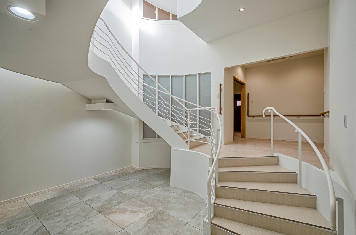 内装は白で統一されており、吹き抜けの螺旋階段が特徴です。