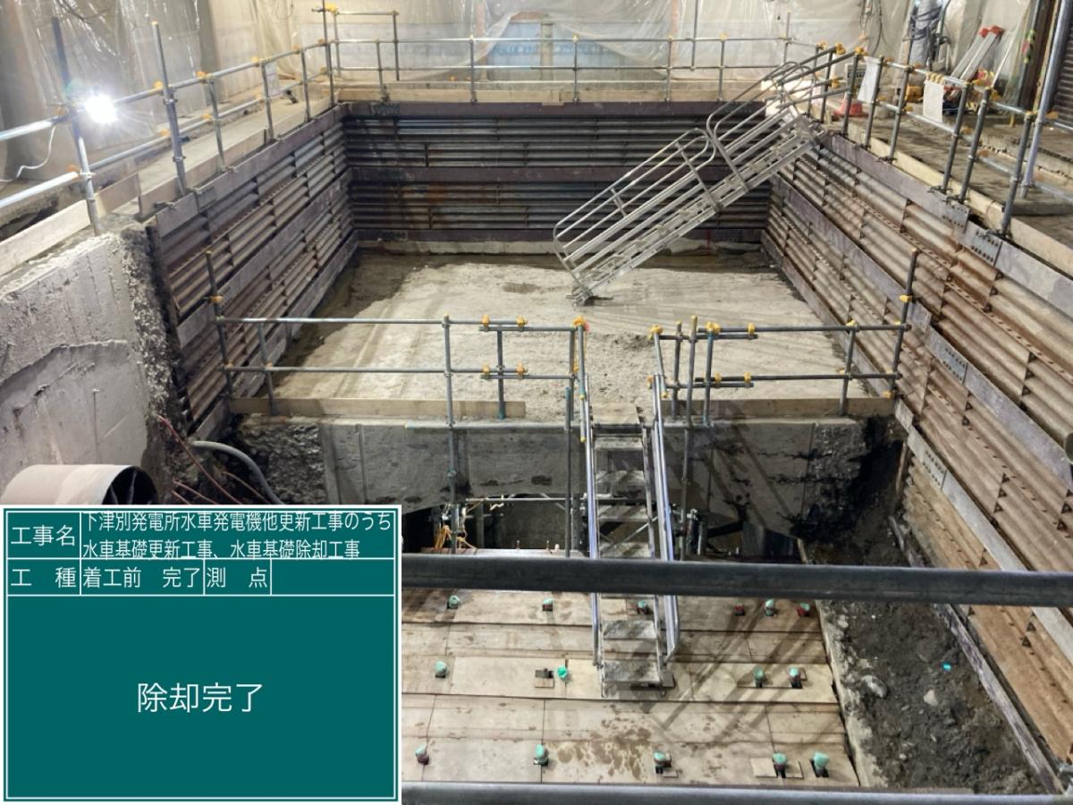 施工実績 ホーム 施工実績 下津別発電所水車発電機他更新工事のうち水車基礎更新工事、水車基礎除却工事 下津別発電所水車発電機他更新工事のうち水車基礎更新工事、水車基礎除却工事土木ダム・発電所道東2024年竣工本工事は下津別発電所水車発電機他更新工事に伴う、 水車発電機基礎更新及び水車発電機基礎除却を行う工事です。 下津別発電所は1925年に竣工した水力発電所で、 100年ほど経過していることから劣化が進んでいるため、 既設コンクリートを取り壊し新たにコンクリートを打設し基礎の更新を行いました。 概要竣工2024年11月用途ダム・発電所所在地北海道網走郡津別町発注者ほくでんエコエナジー株式会社前へ戻る戻る次へ